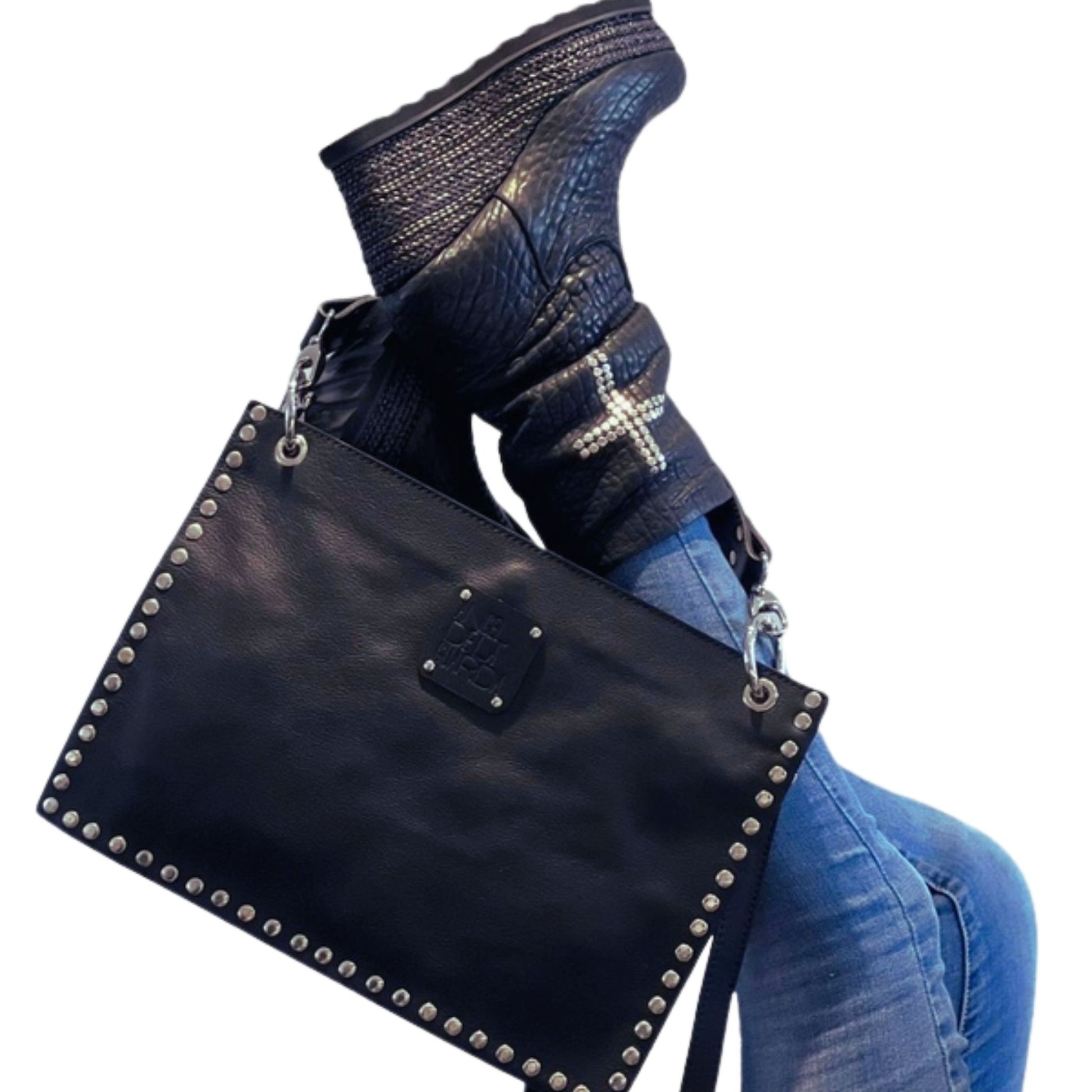 Bota de caña media arrugada. Piel de cordero negro grabado. Adorno en forma de cruz con tachas de color plata.