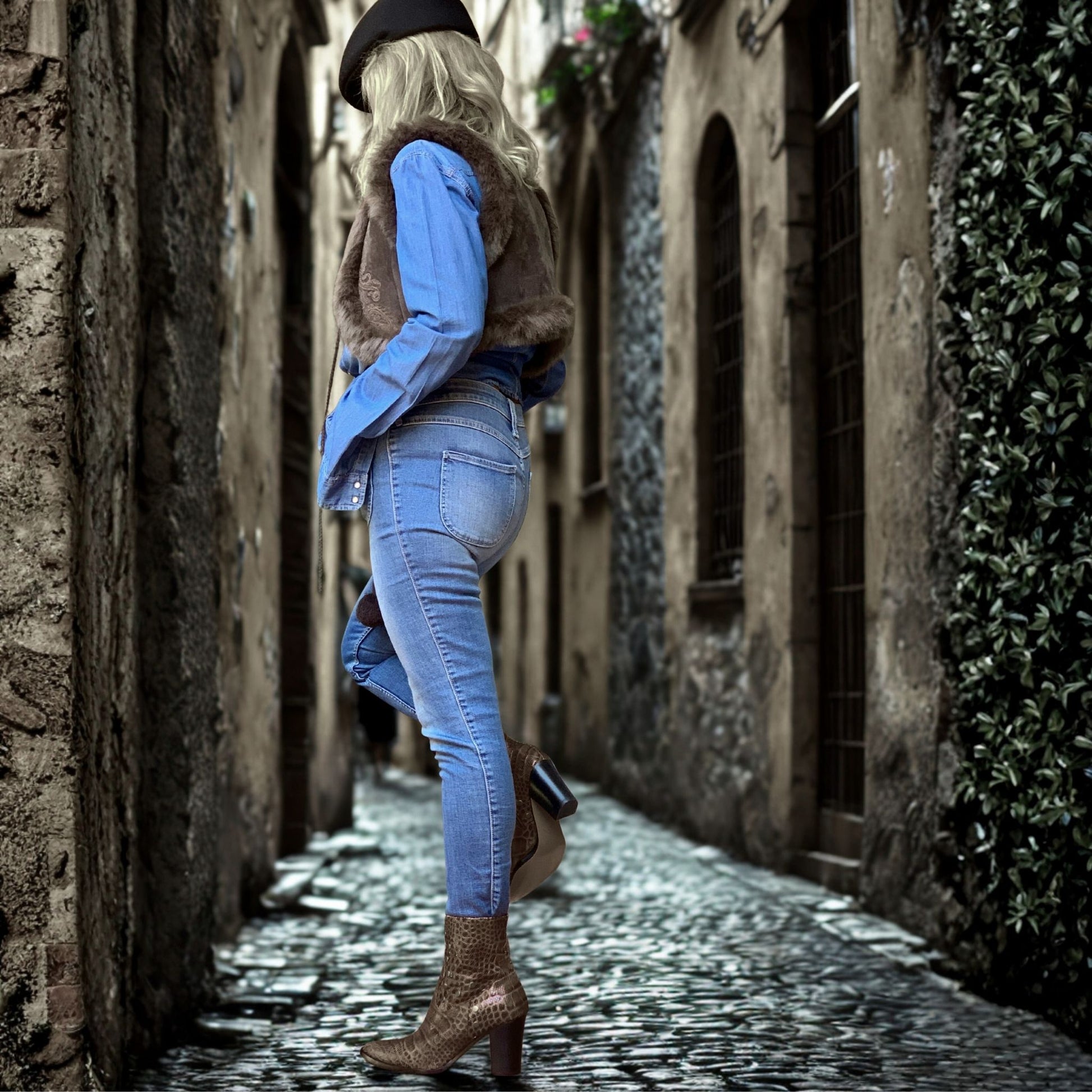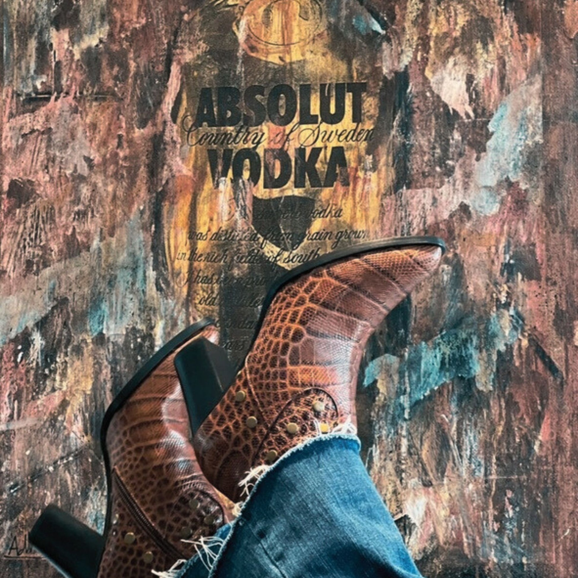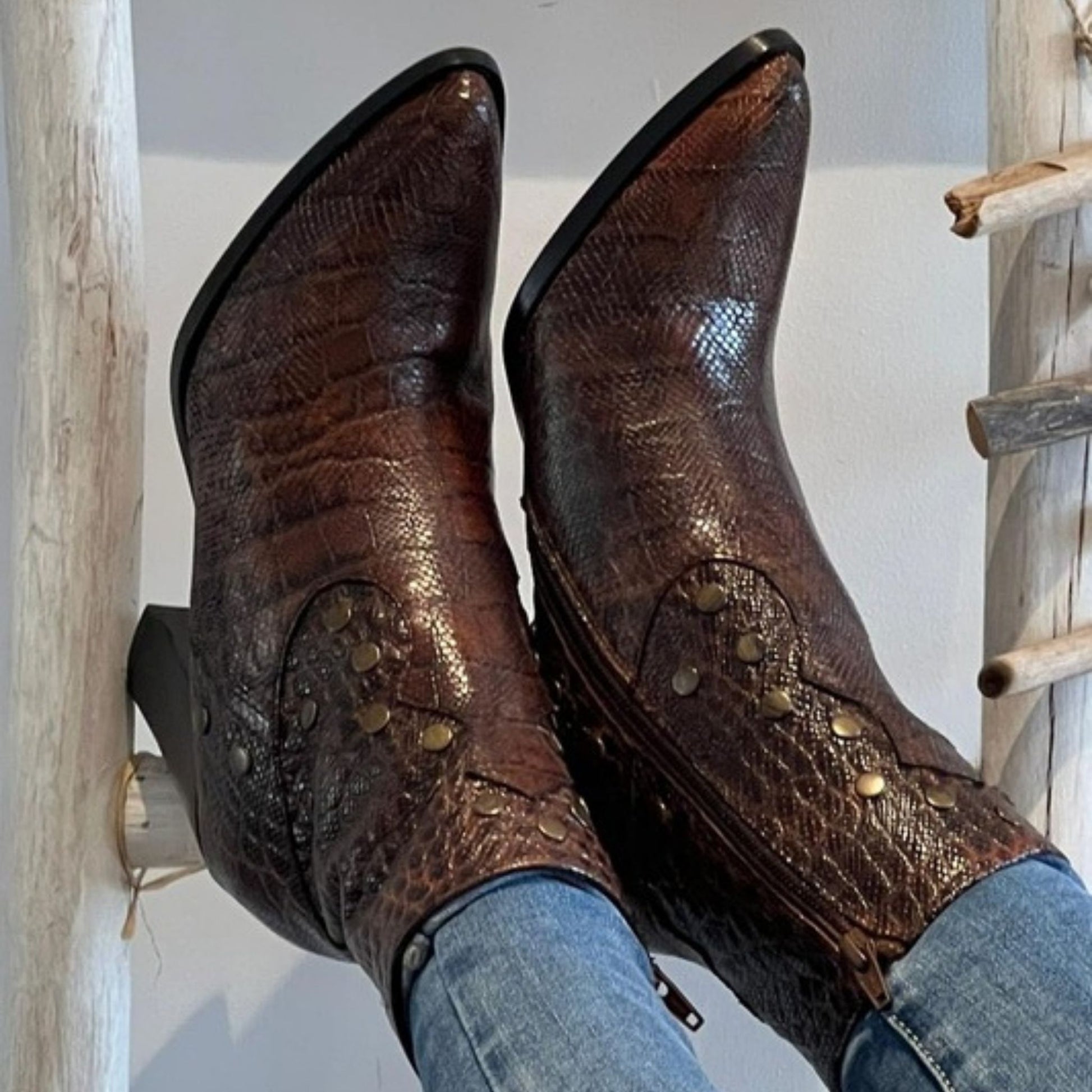 En piel vacuno fantasía coco de color marrón oscuro y ribeteado con tachas oro viejo.