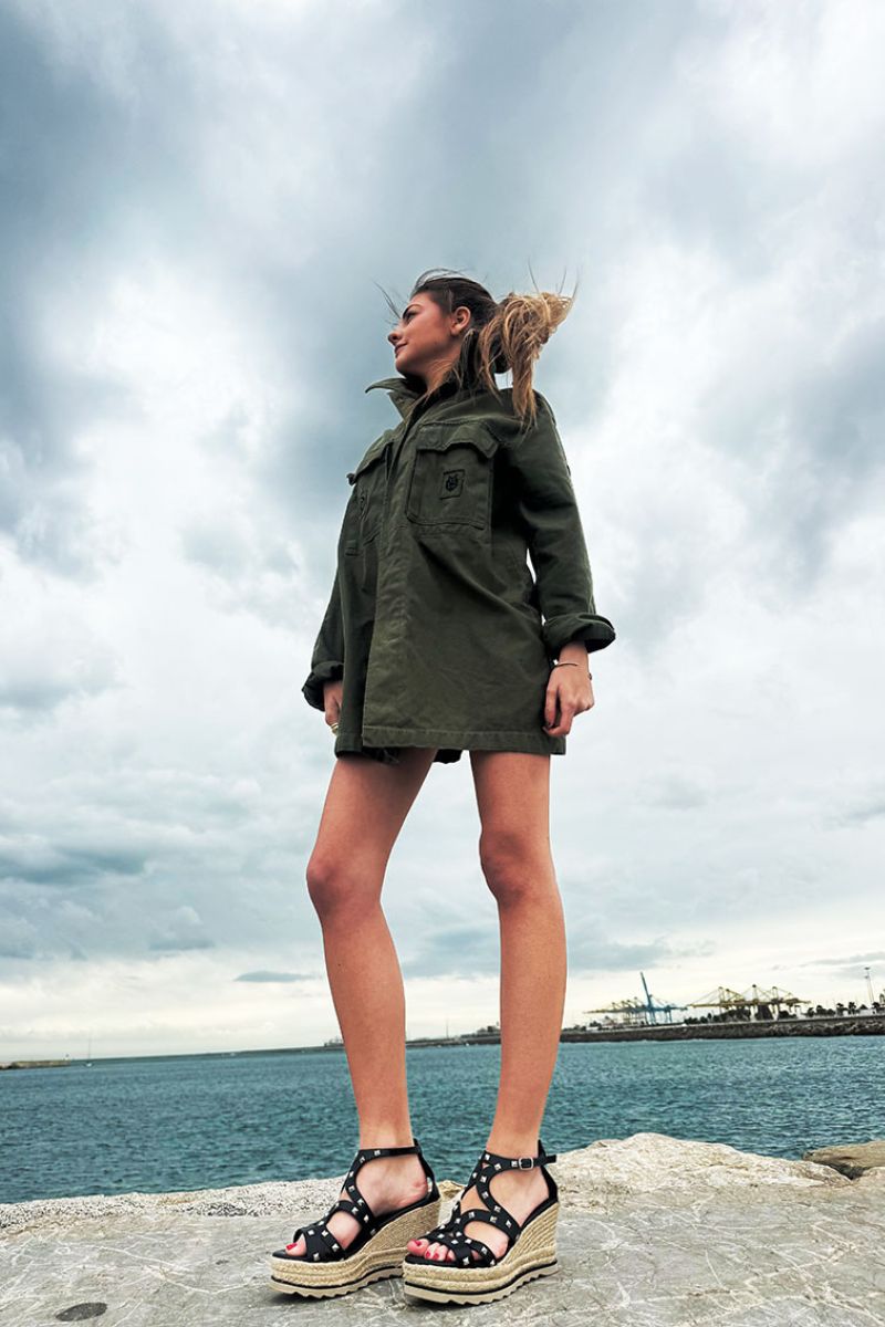 Mo, siempre cercana, aunque esté en alta mar con la mochila de un palmo, algún par de kaftanes, un montón de libros y nada de cobertura. Y cuando aparece, transmite tanta energía positiva que desearías irte con ella a cualquier parte. Sabe cuidar y cuidarse, y su aspecto se ilumina al contacto con la naturaleza. La piel fina y dorada, el rubio de su niñez, la mirada limpia y brillante; con ese encanto innato y mucha soltura, puede con cualquier estilo.