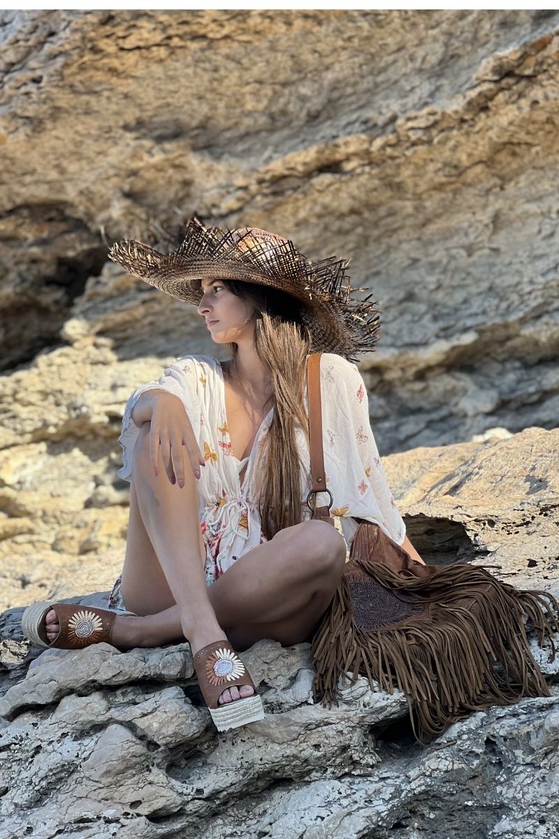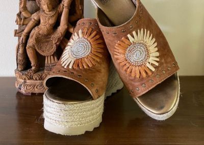 Esta sandalia está diseñada para trotar mundos. La hacemos en 3 alturas: baja ( 7 cms) , media (10 cms) y alta (12 cms). Con forma de zueco y una plataforma de corcho forrada en yute que NO PESA NADA . Es el colmo de la comodidad. Se acabaron los dolores de pies y de espalda tan característicos de los tacones. "0" impactos al caminar. Ligera y adaptable. Forramos nuestras sandalias con la mejor piel natural para que no te roce el pie, ni te haga llagas, y.. muy importante: la planta va forrada en cordero .. evita que te sude el pie y resbale al caminar. Diseñamos y producimos en España pensando sólo en tu confort y en que estés GUAPÍSIMA.
